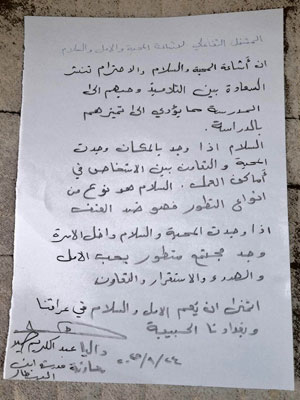 وللطفولة نصيب في هذا المشغل.. روان أشرف، التلميذة في مدرسة ابن البيطار والبالغة من العمر 9 سنين، كتبت بعفوية: أحب مدرستي، لأنهم يحبونني ولأن تعاملهم حلو. يوفرون الهدايا والاحتفالات. أحب كل معلماتي والمدرسة والدراسة وصديقاتي.