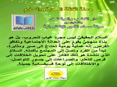حملة ثقافة المحبة والسلام بإشراف المدير العام لدار الكتب والوثائق وكالة السيد بارق رعد علاوي، وبالتعاون مع مجلة سماء الأمير الإلكترونية المعنية بالمحبة والسلام والتعايش والتسامح واحترام التنوع الثقافي.